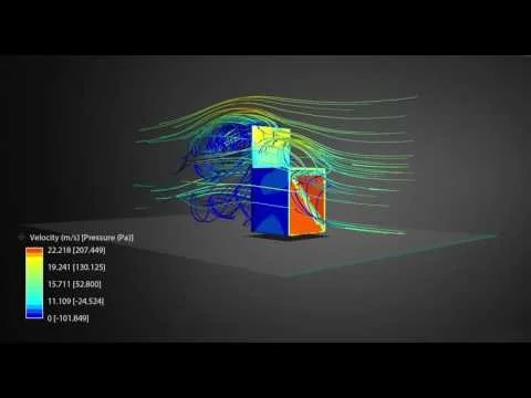 The piece is one of a set that models each of the BVB 84/85 chair series by Donald Judd. Digital 3D models were imported into a digital wind-tunnel whose parameters were set to approximate the airflow of a vertically mounted commercial air-curtain (a kind of fan that creates a thin sheet of air movement). The chair is presented as a polychrome sculpture (based on the surface pressure plot from the model) in front of said air-curtain, with a projected video of the running model.